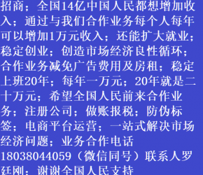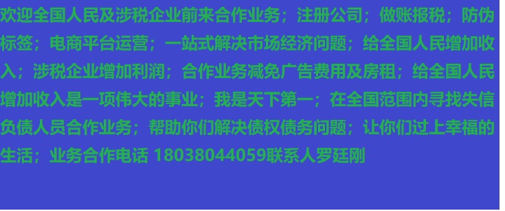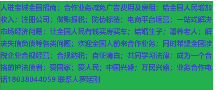 人進(jìn)寶城全國(guó)招商;合作業(yè)務(wù)減免廣告費(fèi)用;歡迎全國(guó)涉稅企業(yè)前來合作;業(yè)務(wù)合作電話 18038044059 聯(lián)系人羅廷剛